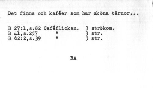 //// * '. . ] //// Det finns och kaféer som har sköna tärnor... //// B 27:l,s.82 Cafeflickan. 3 strökom. //// B 41,s.257 " 3 str. //// B 62:2,s.39 " 3 str. //// RA ////
