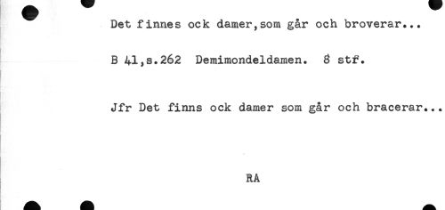 //// Det finnes ock damer,som går och broverar*.. //// B 41*s.2é2 Demimondeldamen. 6 stf. //// Jfr Det finns ock damer som går och bracerar.. //// [ //// t //// RA ////