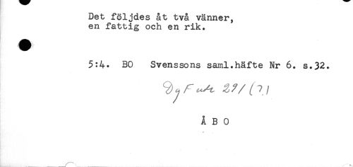 //// Det följdes åt två vänner, //// en fattig och en rik. //// 5:4. BO Svenssons saml.häfte Nr 6. s.32. //// ÅBO //// —- //// ,___ _ ////