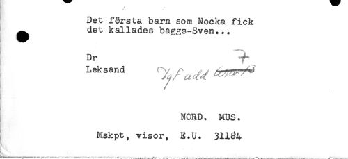 //// f //// Det första barn som Nocka fick //// ^ det kallades baggs-Sven+.+ //// . //// Dr //// Leksand Cy , ^ /yr-rrT^ //// NORD. MUS. //// Mskpt, visor, E.U. 31134 //// _ ... _....... ////