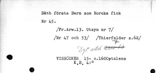 //// , ' . * . * * * ' * . - . . ' ^ //// Däth första Barn som Norcka fick //// Nr 45. //// /Fr.Arw.13. Utsyn nr 7 //// //Nr 47 och 53/ /Thierfelder s.62 //// /^ VISBÖCKER 15- o.l600ptalens //// K.B. 4:° //// - ////