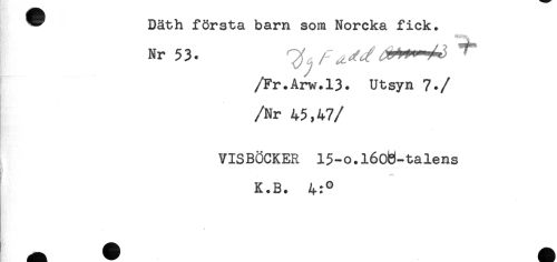 //// * Däth första barn som Norcka fick. //// Nr 53. //// /Fr.Arw.13. Utsyn 7. //// //Nr 45,47 //// /VISBÖCKER 15-o.l60)3-talens //// t ' //// K.B. ////