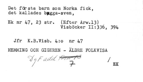 //// Det första barn som Norka fick, //// det kallades bpgga-sven, //// Ek nr 47, 23 str. (Efter Arw.13) //// Visböcker 11:336, 394 //// Jfr K.B.Visb. 4:o nr 47 //// HEMMING OCH GIGEREN - ÄLDRE FOLKVISA //// ^ EK ////