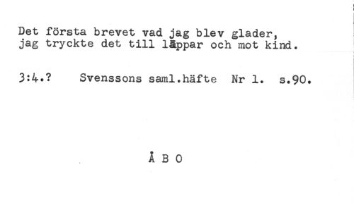 //// Det första brevet vad jag blev gläder, //// jag tryckte det till läppar och mot kind. //// i //// i //// 3:4.? Svenssons saml.häfte Nr 1. s.90. //// ÅBO ////