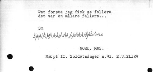 //// Det första jag fick se fallera //// det var en målare fallera... //// Sm //// NORD. MUS. //// . . - ' ^ . . ^ - * * //// ^ Mäcpt II. Soldatsånger s.91. E.U.21129 ////
