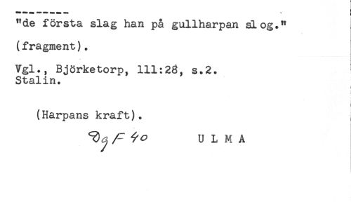 //// "de första slag han på gullharpan slog." //// (fragment). //// Vgl., Björketorp, 111:23, s.2. //// Stalin. //// t //// i //// (Harpans kraft). , //// ^ U L M A ////