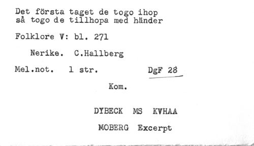 //// Det första taget de togo ihop //// så togo de tillhopa med händer //// Folklore V: bl. 271 //// Nerike. C.Hallberg //// Mel.not. 1 str. DgF //// Kom. //// DYBECK MS KVHAA //// MOBERG Excerpt ////