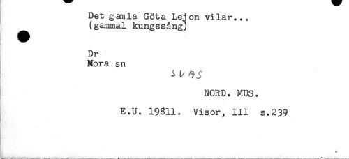 //// Det gamla Göta Lejon vilar... //// (gammal kungssång) //// ^^^ t //// Dr //// Mora sn //// i t/ .'"^J //// NORD. MUS. //// E.U. 19311. Visor, III s.239 //// * ////