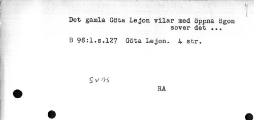 //// - - - - ----- - - ... < . .-., . . ... . _ . b //// Det gamla Göta Lejon vilar med öppna ögon //// sover det ... //// B 93:l.s.l27 Göta Lejon. 4 str. //// i //// ^ RA ////