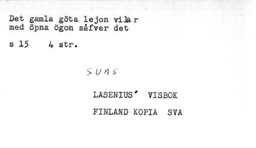 //// Det gamla göta lejon vi3ar //// med öpna ögon såfver det //// s 15 4 str. //// LASENIUS * VISBOK //// FINLAND KOPIA SVA ////