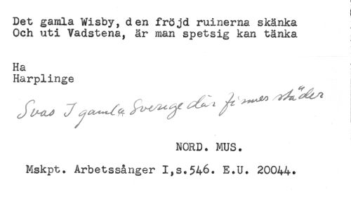 //// ! //// i //// Det gamla Wisby, den fröjd ruinerna skänka //// Och uti Vadstena, är man spetsig kan tänka //// < //// Ha //// Harplinge //// NORD. MUS. //// Mskpt. Arbetssånger I,s.$46. E.U. 20044. ////