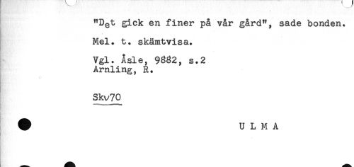 //// "Det gick en finer på vår gård"; sade bonden. //// ** //// Mel. t. skämtvisa. //// Vgl. Asle, 9832, s.2 //// Arniing, R. //// Skv70 //// —y^MMU,^ ... //// # U L M A ////
