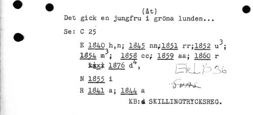 //// Det gick en jungfru i gröna lunden... //// ^ Se: C 25 //// E 1^40 h,n; 1845 nn;l851 rr;l852 u^; //// 1354 m^i 1853 cc; 1859 aa; 1860 r //// N 1855 i //// R 1341 a; 1844 a ^ //// KB:d SKILLINGTRYCKSREG. ////