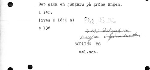 //// ^ ue^ gicK en jungfru pa gröna ängen. //// 1 str. //// (Svas E 1840 h) //// SODLING MS //// mel.not. //// ^^ Sy ^ ////