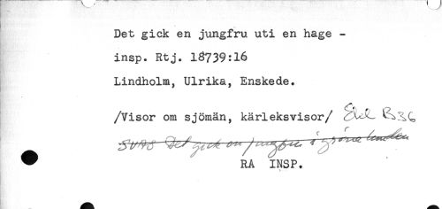 //// ! # //// Det gick en jungfru uti en hage - //// insp. Rtj. 18739:16 //// Lindholm, Ulrika, Enskede. //// /Visor om sjömän, kärleksvisor //// /^ RA INSP. ////
