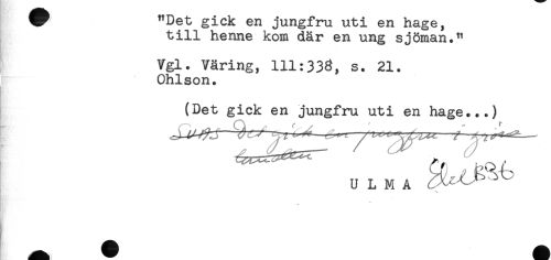 //// W "Det gick en jungfru uti en hage, //// till henne kom där en ung sjöman." //// Vgl. Väring, 111:338, s. 21. //// Ohlson. //// (Det gick en jungfru uti en hage...) //// U L M A ^ //// il! n ////