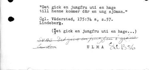 //// "Det gick en jungfru uti en hage //// } till henne kommer där en ung sjöman." //// Ogl. Väderstad, 175:74 a, s.57* //// Lindeber^. //// (Det gick en jungfru uti en hage...) //// ' ULM A //// ....... ... f . . ^ ////