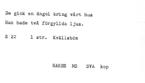 //// De gick en ängel kring vårt hus //// Han hade två förgyllda ljus. //// S 22 1 str. Kvällsbön //// HARBE MS SVA kop ////