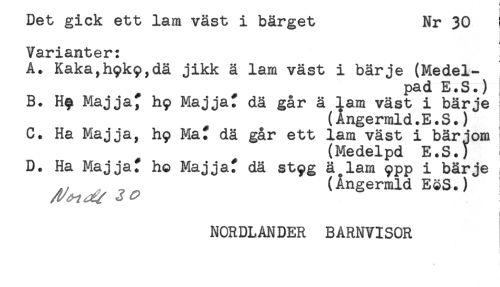 //// Det gick ett lam väst i bärget Nr 30 ! //// i //// i //// < //// Varianter: //// A. Kaka,hyky,dä jikk ä lam väst i bärje (Medel- //// pad E.S.) //// B. H? Majja^ hy Majja? dä går ä lam väst i bärje //// (Angermld.E.S.) //// C. Ha Majja, hy Maf dä går ett lam väst i bärjom //// (Medelpd E.S.) //// D. Ha Maj jaf ho Majjaf dä styg ä lam ypp i bärje //// (AngermldEöS.) //// NORDLANDER BARNVISOR ////