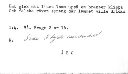 //// Det gick ett litet lamm uppå en branter klippa //// Och falska räven sprang där lammet ville dricka //// 1:4. VÅ. Brage 2 nr 16. //// A B 0 ////