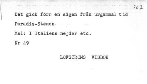 //// , ,— ^ — - . - - r - - ' ' — ' ** ^ j^/jp ^ //// s * ' //// Det gick förr en sägen från urgammal tid //// Paradis-St4nen^ //// Mel: I Italiens nejder etc. //// Nr 49 //// LOFSTROMS VISBOK //// ^ < ////