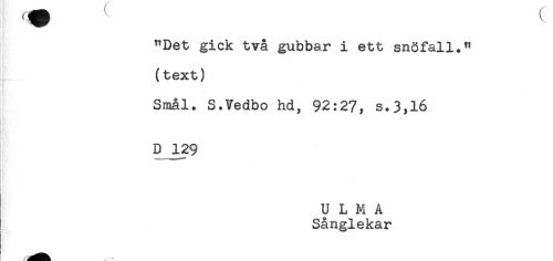 //// "Det gick två gubbar i ett snöfall." //// (text) //// Smål. S.Vedbo hd, 92:27, s.3,16 //// D 129 //// U L M A //// Sånglekar ////