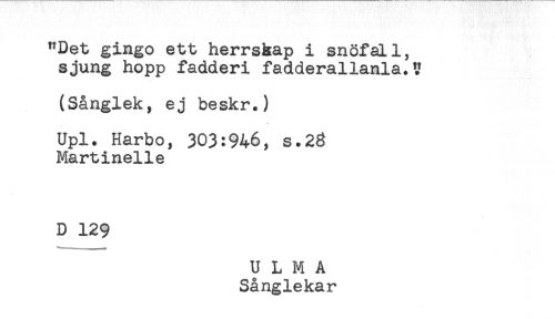 //// "Det gingo ett herrskap i snöfall, //// sjung hopp fadderi fadderallanla.T //// (Sånglek, ej beskr.) //// Upl. Harbo, 303:946, s.23 //// Martinelle //// D 129 //// U L M A //// Sånglekar ////