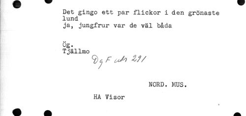 //// Det gingo ett par flickor i den grönaste //// lund //// ja, jungfrur var de väl båda //// * * //// Og. //// Tjällmo //// NORD. MUS. //// HA Visor //// * ////