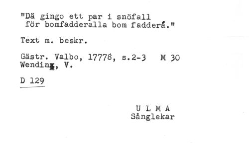 //// "Dä gingo ett par i snöfall //// för bomfadderalla bom fadderå." //// Text m. beskr. //// Gästr. Valbo, 17773, s.2-3 M 30 //// Wendin^, V. //// D 129 //// U L M A //// Sånglekar ////