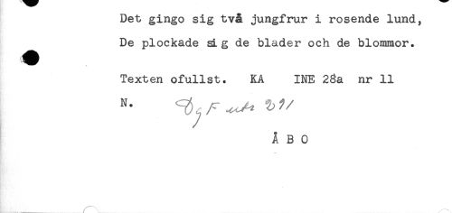 //// Det gingo sig två jungfrur i rosende lund, //// De plockade sLg de blader och de blommor. //// Texten ofullst. KA INE 28a nr 11 //// N. '' ,, . //// ÅBO //// \ //// //// // .. //// /