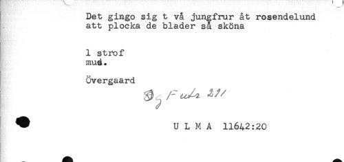 //// Det gingo sig t vå jungfrur åt rosendelund //// att plocka de blader sa sköna //// HM*. * //// 1 strof //// muå. //// Övergaard //// ^ U L M A 11642:20 ////