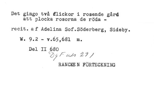 //// Det gingo två flickor i rosende gård //// att plocka rosorna de röda - //// recit. af Adelina Sof.Söderberg, Sideby. //// W. 9.2 - v.65,631 m. //// Del II 630 //// RANCKEN FÖRTECKNING ////