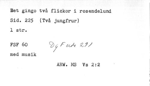 //// Bet gingo två flickor i rosendelund //// . * //// Sid. 225 (Två jungfrur) //// 1 str. //// FSF 60 ^ //// med musik //// ARW. MS Vs 2:2 //// } ////