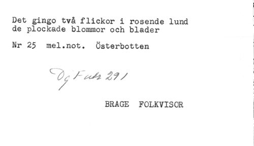//// Det gingo två flickor i rosende lund //// de plockade blommor och blader //// Nr 25 mel.not. Österbotten //// / : //// BRAGE FOLKVISOR ////
