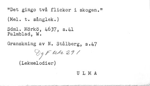 //// "Det gingo två flickor i skogen." //// (Mel. t. sånglek.) //// Sdml. Hörkö, 4637, s.41 //// Palmblad, W. //// Granskning av N. Stålberg, s.47 //// (Lekmelodier) //// U L M A ////