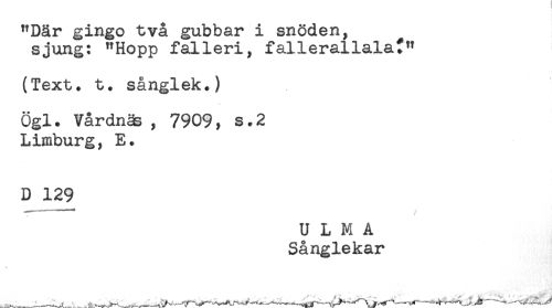 //// "Där gingo två gubbar i snöden, //// sjung: "Hopp falleri, fallerallalaf" //// (Text. t. sånglek.) //// Ögl. Vårdnäs , 7909, s.2 //// Limburg, E. //// D 129 //// U L M A //// Sånglekar ////