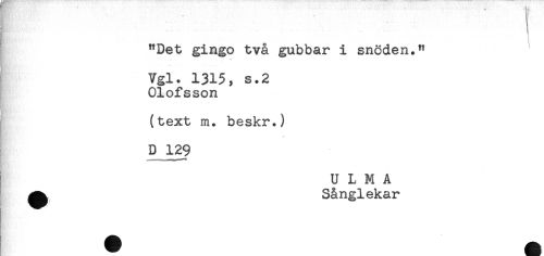 //// "Det gingo två gubbar i snöden." //// .. - * //// Vgl. 1315, S.2 //// ! Olofsson //// (text m. beskr.) //// D 129 //// U L M A //// ^ Sånglekar ////