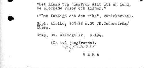 //// "uet gingo *uva jungirur ant uti en lund, //// De plockade rosor och liljor." //// ^^ ("Den fattiga och den rika", kärleksvisa). //// Uppl. Alsike, 303:38 s.29 /E.Cederström //// /Öberg. //// Grip, Sv. Allmogeliv, s.194* //// (De två jungfrurna). //// q) .,27 //// /U L M A ////