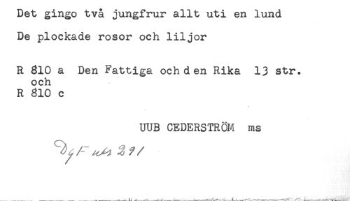 //// Det gingo tva jungirur allt uti en lund //// De plockade rosor och liljor //// R 310 a Den Fattiga och den Rika 13 str. //// och //// R 810 c //// UUB CEDERSTRÖM ms ////