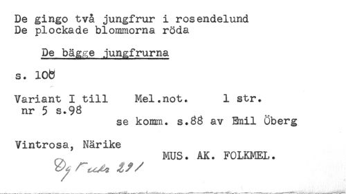 //// De gingo två jungfrur i rosendelund //// De plockade blommorna röda //// De bä^ge jungfrurna //// s* 10(3 //// Variant I till Mel.not. 1 str. //// nr 5 s.93 //// se komm. s.33 av Bail Öberg //// Vintrosa, Närike //// MUS. AK. FOLKMEL. ////