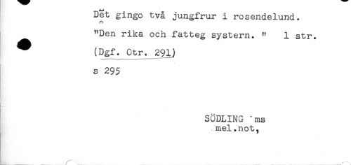 //// Det gingo två jungfrur i rosendelund. //// "Den rika och fatteg systern. " 1 str. //// ^ (Dgf. Ctr. 291] //// s 295 //// . - . . //// SÖDLING ^ ms //// I .mel.not, ////