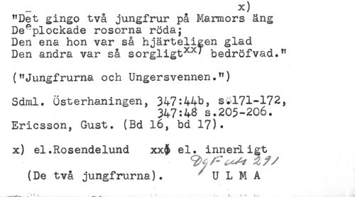 //// "Det gingo två jungfrur på Marmors äng //// De^plockade rosorna röda; //// Den ena hon var så hjärteligen glad //// Den andra var så sorgligt^xl bedröfvad." //// ("Jungfrurna och Ungersvennen.") //// Sdml. Österhaningen, 347:44b, s§171-172, //// 347:43 s.205-206. //// Ericsson, Gust. (Bd 16, bd 17). //// x) el.Rosendelund xx% el. innerligt //// (De två jungfrurna). U L M A //// ....--^ ^ ^ ' ' : : T - ' ////