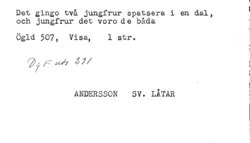 //// Det gingo två jungfrur spatsera i en dal, //// och jungfrur det voro de båda //// Ögld 507, Visa, 1 str. //// ! //// t- //// - H //// i //// ANDERSSON SV. LÅTAR //// < //// < //// : ////