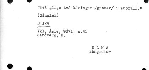 //// "Det gingo två käringar /gubbar/ i snöfall." //// (Sånglek) //// D 129 //// Vgl, Åsle, 9871, s.31 //// Sandberg, E. //// U L M A //// S&nglekar ////