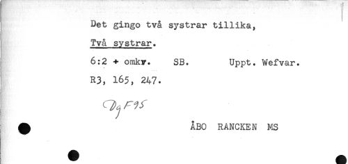 //// **" — ^ -- . -....... .. - ... ... . //// Det gingo två systrar tillika, //// Två systrar. //// 6:2 + omkv. SB. Uppt. Wefvar. //// R3, 165, 247. //// i //// L A, //// ^ ÅBO RANCKEN MS ////