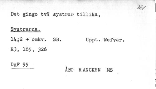 //// Det gingo två systrar tillika, //// Systrarna. //// 14;2 + omkv. SB. Uppt. Wefvar. //// R3, 165, 326 //// DgF 95 //// ABO RANCKEN MS //// t //// * r ////