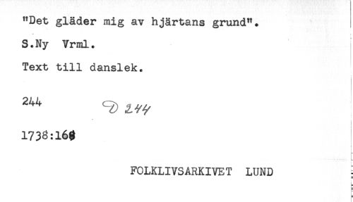 //// "Det gläder mig av hjärtans grund". //// S.Ny Vrml. //// Text till danslek. //// 1738:16$ //// FOLKLIVSARKIVET LUND ^ ////