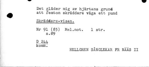 //// Det gläder mig av hjärtans grund //// ^ att femton skräddare väga ett pund //// Skräddare-visan. //// ^ Nr 91 (65) Mel.not. 1 str. //// s.39 //// D 244 //// komm. //// HELLGREN SÅNGLEKAR FR NÄÄS II ////