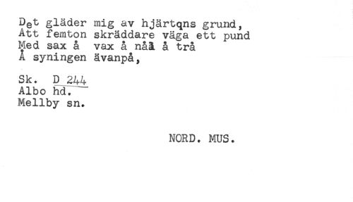 //// Dgt gläder mig av hjärtqns grund, //// Att femton skräddare väga ett pund //// Med sax å vax å nåå å trå //// A syningen ävanpå, //// Sk. D 244 //// Albo hdJ //// Mellby sn. //// NORD. MUS. ////