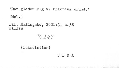 //// "Det gläder mig av hjärtans grund." //// (Mel.) //// Dal. Malingsbo, 2001:3, s.33 //// Hällen //// ^ 4- //// /(Lekmelodier) //// U L M A ////